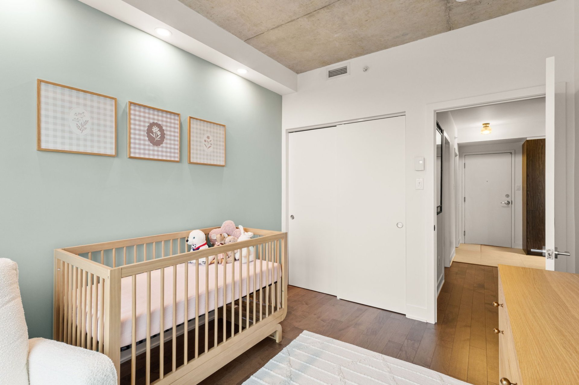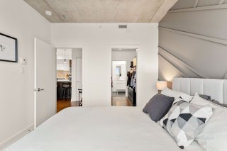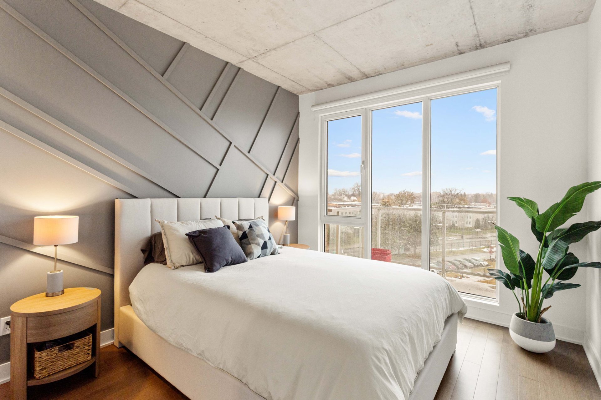 and a wood accent wall in the primary bedroom.