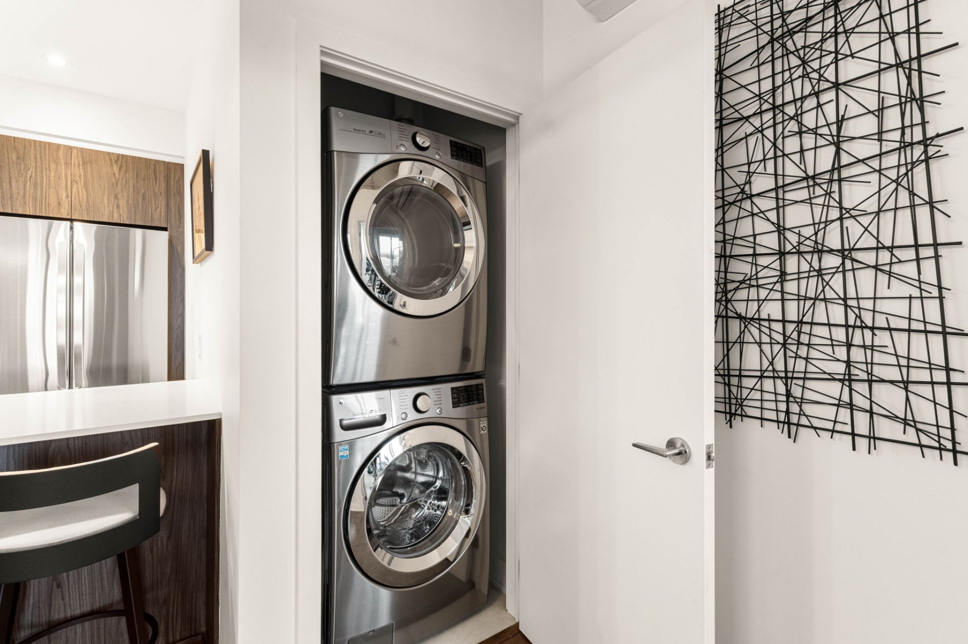 Circular light fixture over dining table, fridge, washer/dryer, stove.
