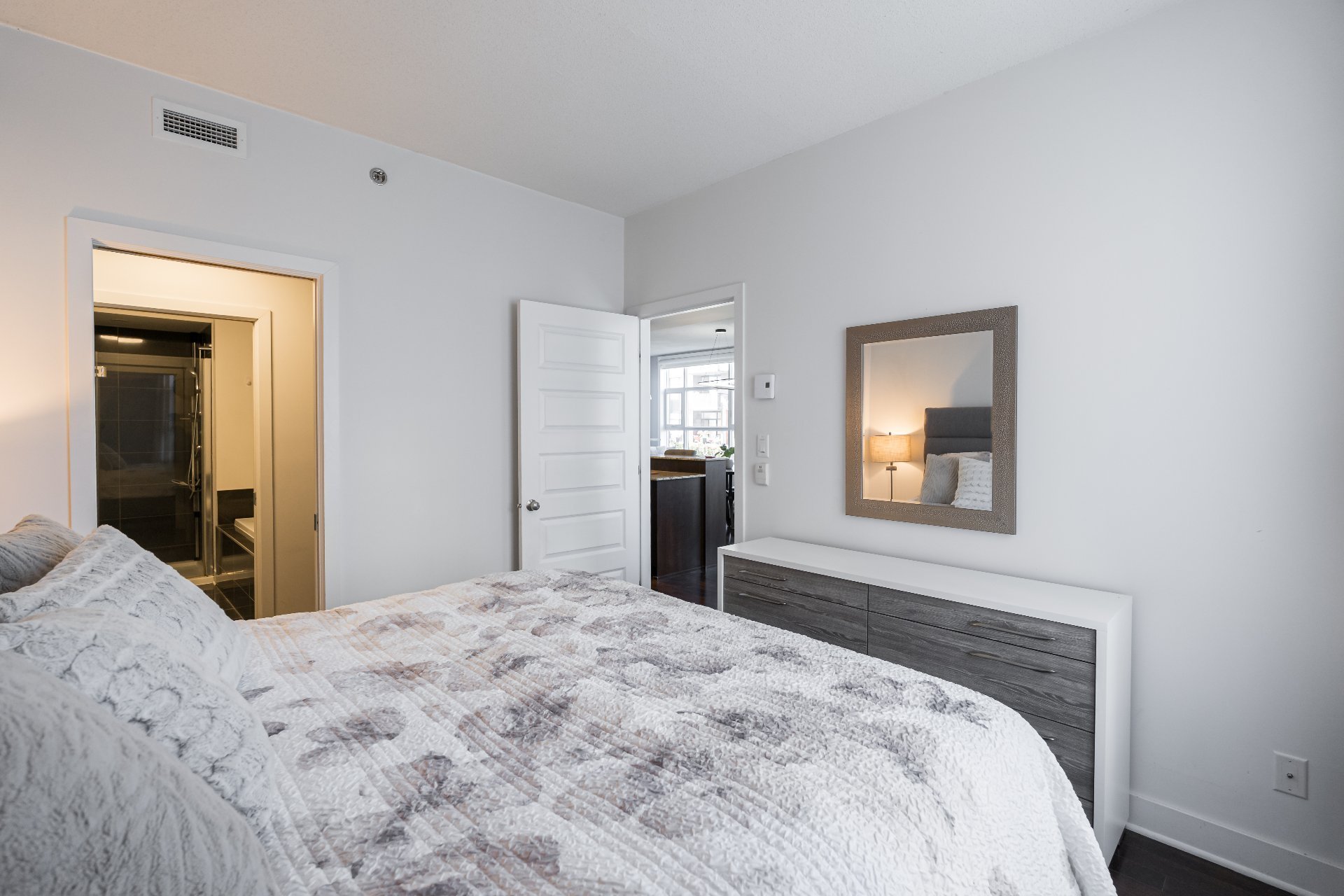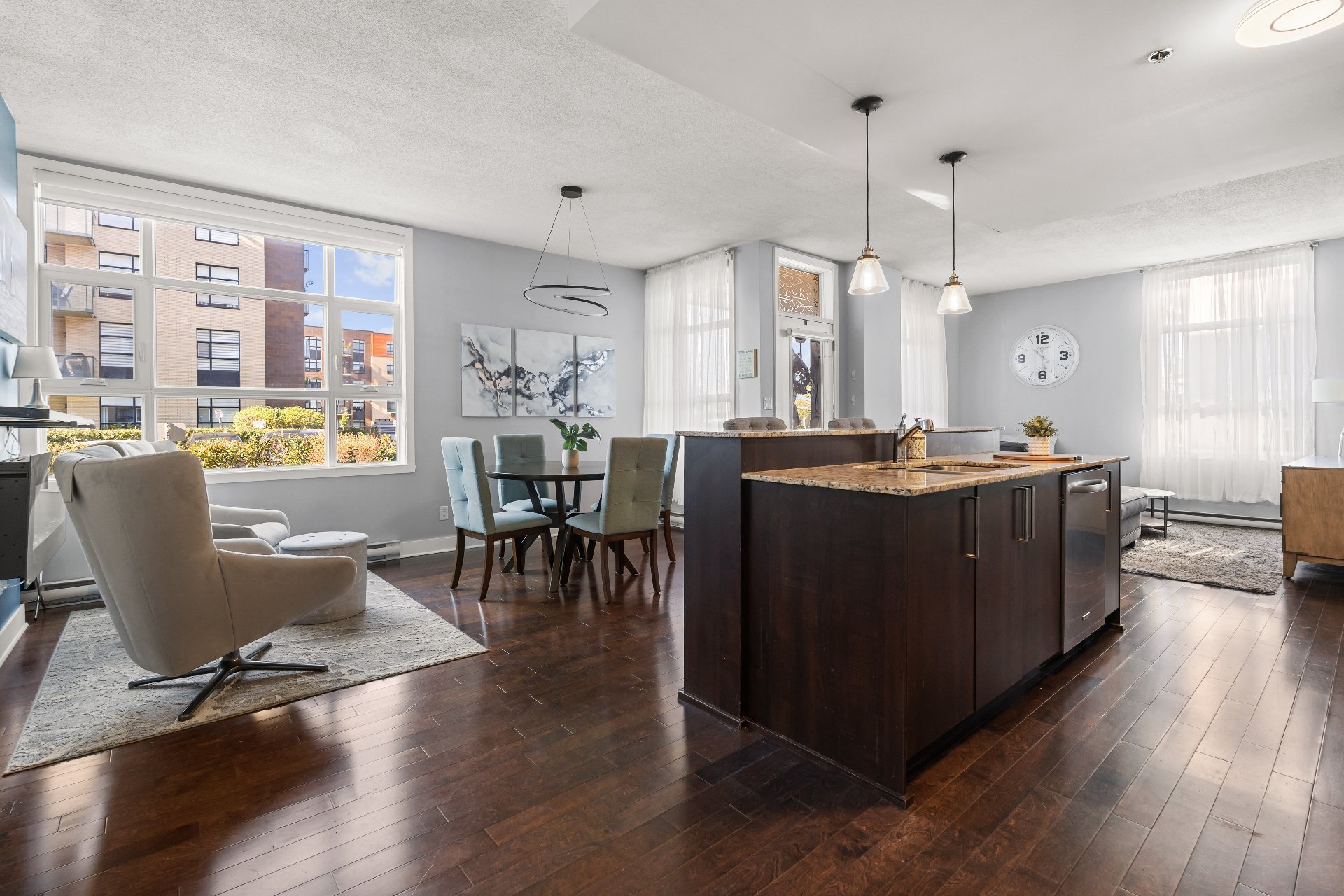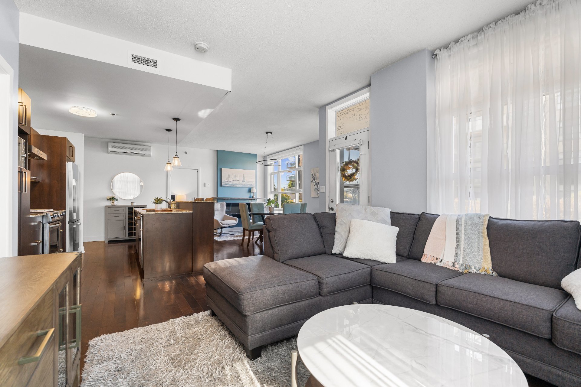 Welcome to this 2-bedroom, 2-bathroom executive corner unit, ideally situated in the sought-after Le Onze de la Gare project in Vaudreuil. Located just steps from Les Avenues Vaudreuil and a wide range of amenities, this upscale condo offers the perfect blend of luxury, comfort, and convenience.