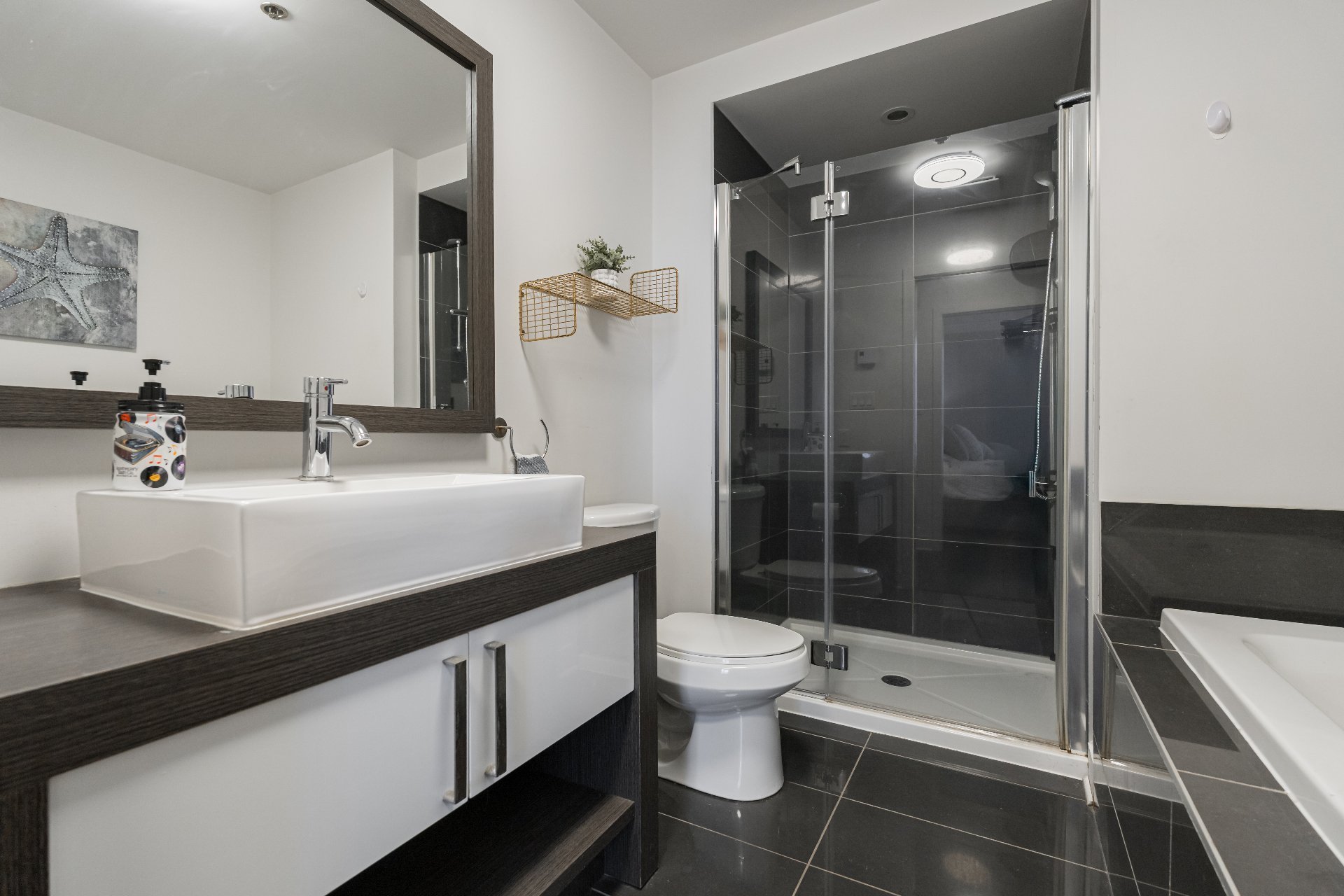 glass shower and separate soaker tub. A generous second