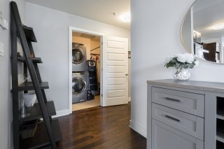 Fridge, stove, washer/dryer, TV, electric fireplace, shelf above fireplace